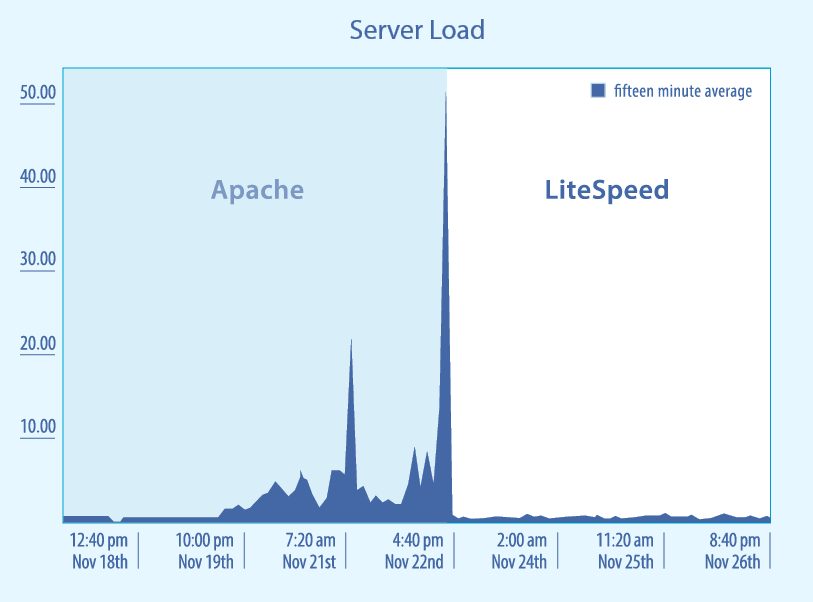 Comparando Litespeed con Apache, si actualmente utilizas apache puedes duplicar la capacidad de ambos, Litespeed puede manejar multiples clientes a la vez consumiento la minima cantidad de recursos, esta es la mejor opción, mucho más compatible y se obtiene un servidor más potente, compatible y blindado a nivel de seguridad.