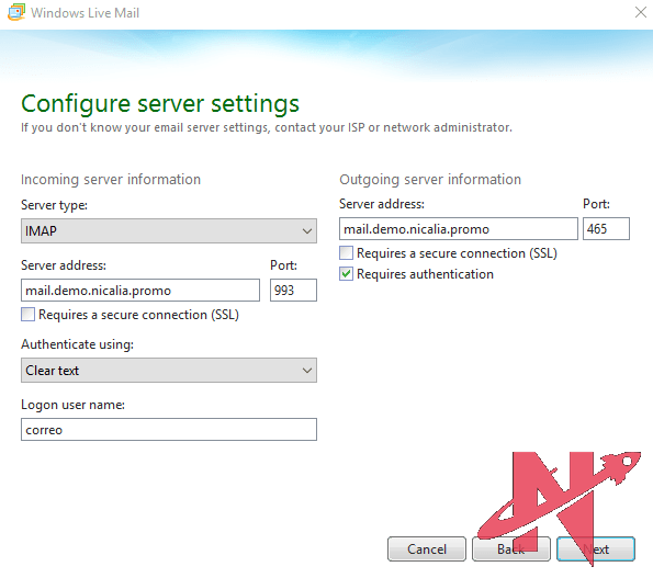 Estos datos los encontramos en la configuración del correo electrónico en cPanel o en el correo de bienvenida que se envía al correo con el que se registro como cliente en Nicalia.