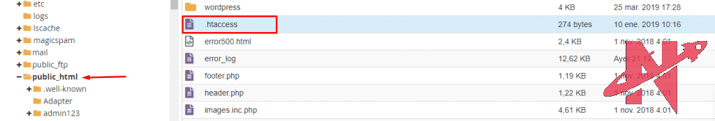 4. Ubica el archivo .htaccess dentro del directorio y renómbralo. Sino puedes verlo debes editar la configuración para que se muestren todos los archivos ocultos.