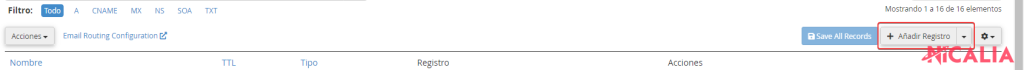 Para añadir un registro DNS accede a WHM → Funciones DNS → Administrador de zona DNS → Administrar (en el dominio).
