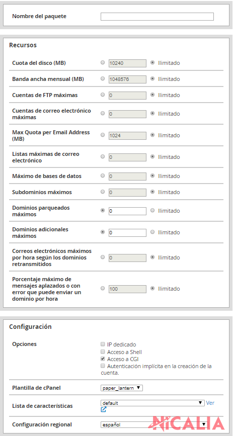 WHM nos permite crear paquetes prestablecidos de recursos que, más adelante, nos permitirá asignar a tantos dominios como deseemos.