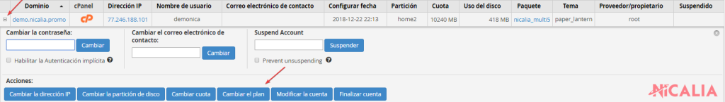 1. Una vez creado el paquete podrás asignárselo a una cuenta que ya existe. Para ello ve a “Enumerar las cuentas” en WHM , localiza la cuenta a la que le queramos cambiar el paquete , haz clic en el icono del “+” justo a la izquierda del nombre del dominio y luego selecciona “Cambiar el plan“