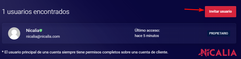 3. En la nueva ventana aparecerá tu usuario principal y los invitados. Para invitar a un nuevo usuario, haz clic en “Invitar usuario