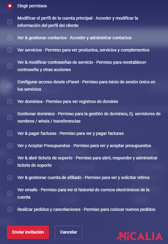 – Elegir permisos: Le podrás otorgar ciertos permisos al nuevo usuario, útil para cuando por ejemplo quieres que ese usuario sólo pueda enviar tickets o ver y pagar facturas.
