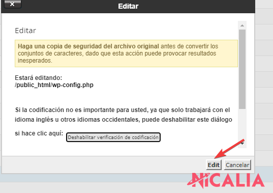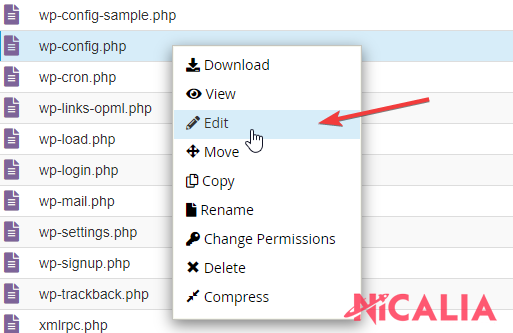 Una vez localizada la carpeta de instalación, puedes editar el archivo “wp-config.php” accediendo desde el administrador de archivos (cPanel >> Administrador de archivos). Luego, haz clic derecho en el archivo “wp-config.php” y en “Edit”.