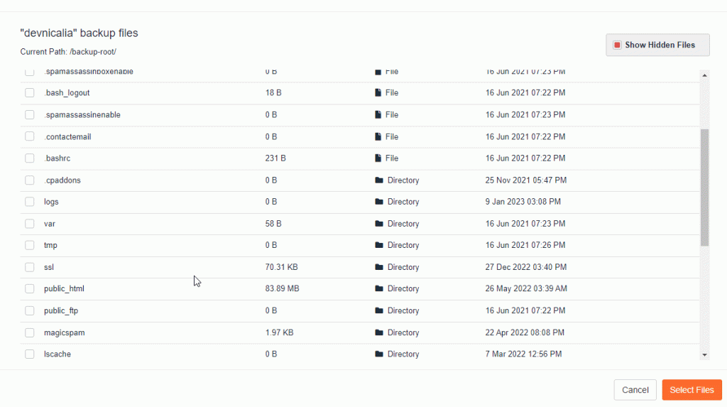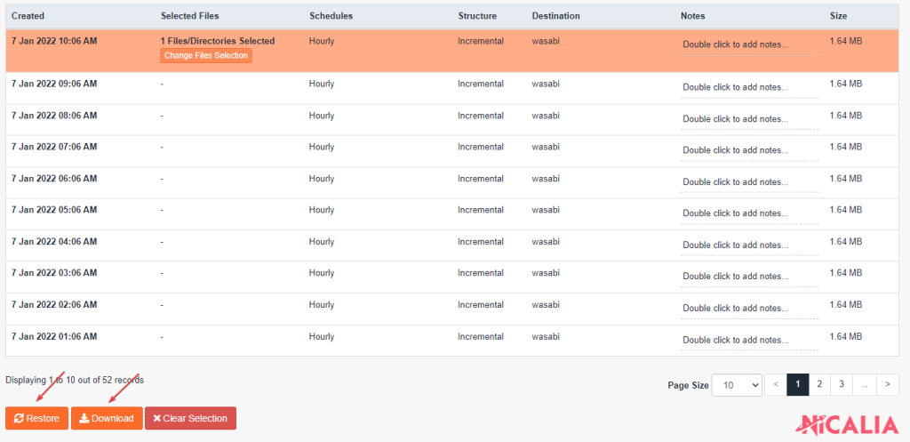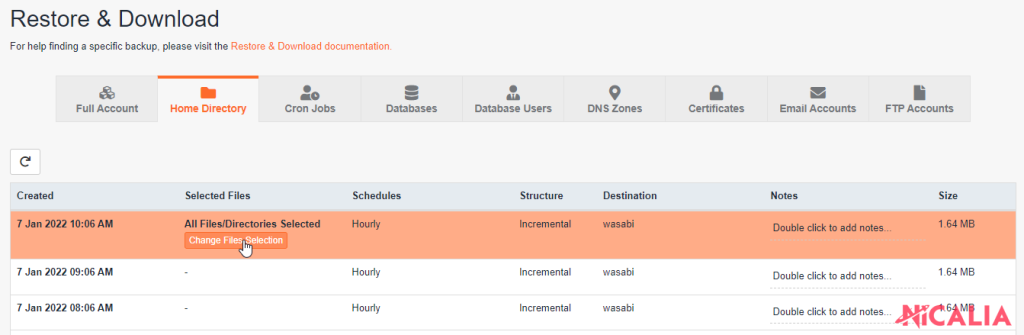 6. En la copia seleccionada deberá aparecer “X Files/Directories Selected”. Haz clic en Restore para restaurar los archivos o en Download para descargarlos.
