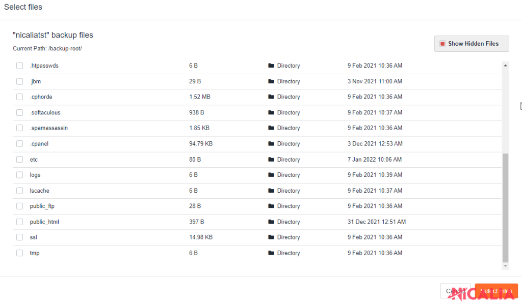 Ejemplo : Si quieres restaurar los archivos del dominio principal, deberías acceder a la carpeta “public_html” y marcar todos los archivos, excluyendo las carpetas* de los dominios/subdominios adicionales si existen.